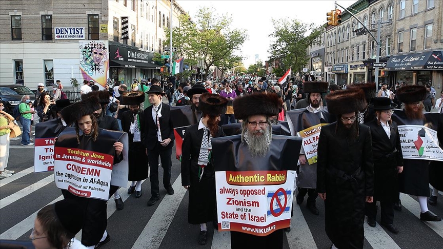 "Özgür Filistin", "İşgali durdur", "Biden soykırımı destekliyor" yazılı dövizler taşıyan binlerce protestocu, İsrail karşıtı sloganlarla tepkisini dile getirdi. İsrail devletinin varlığına karşı olduklarını her fırsatta dile getiren New Yorklu Ortodoks Yahudi Cemaati üyeleri de Nekbe mitinginde en ön saflarda yerini aldı.