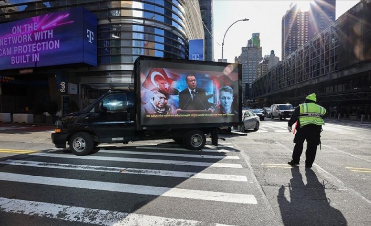 Türk-Amerikan Ulusal Yönlendirme Komitesi (TASC) organizasyonuyla Times Meydanı'nı dolaşan kamyonetteki dijital ekranda FETÖ örgütünün iç yüzünü ve 15 Temmuz darbe girişimini anlatan görseller yayınlandı.