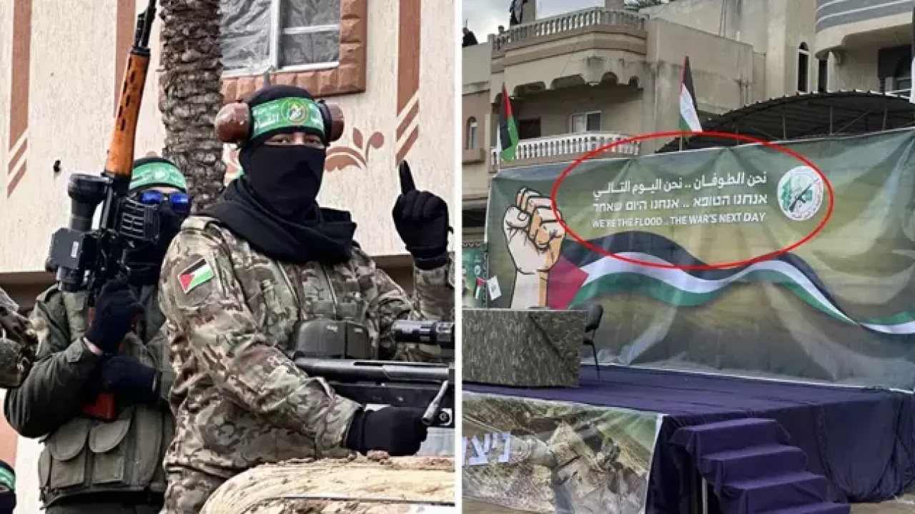 Hamas'ın silahlı kanadı İzzeddin el-Kassam Tugayları, takas anlaşmasının beşinci turunda İsrailli esirlerin teslim edileceği platformun üzerine "Biz tufanız. Savaşın ertesi günü biziz." yazılı büyük bir pankart astı.Arapça, İbranice ve İngilizce olmak üzere üç dilde yazılan ifadeyle ABD Başkanı Donald Trump'ın Gazze'deki Filistinlileri zorla yerinden etme ve savaş sonrası Gazze'de nasıl bir yönetim olacağına ilişkin "Gazze, çatışmalar sona erdiğinde İsrail tarafından ABD'ye teslim edilecek." ifadelerine yanıt verildi.