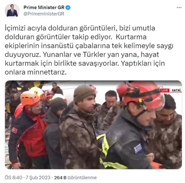 Sosyal medya hesabından Türkçe paylaşımda bulunan Miçotakis, "İçimizi acıyla dolduran görüntüleri, bizi umutla dolduran görüntüler takip ediyor. Kurtarma ekiplerinin insanüstü çabalarına tek kelimeyle saygı duyuyoruz. Yunanlar ve Türkler yan yana, hayat kurtarmak için birlikte savaşıyorlar. Yaptıkları için onlara minnettarız." ifadesini kullandı.