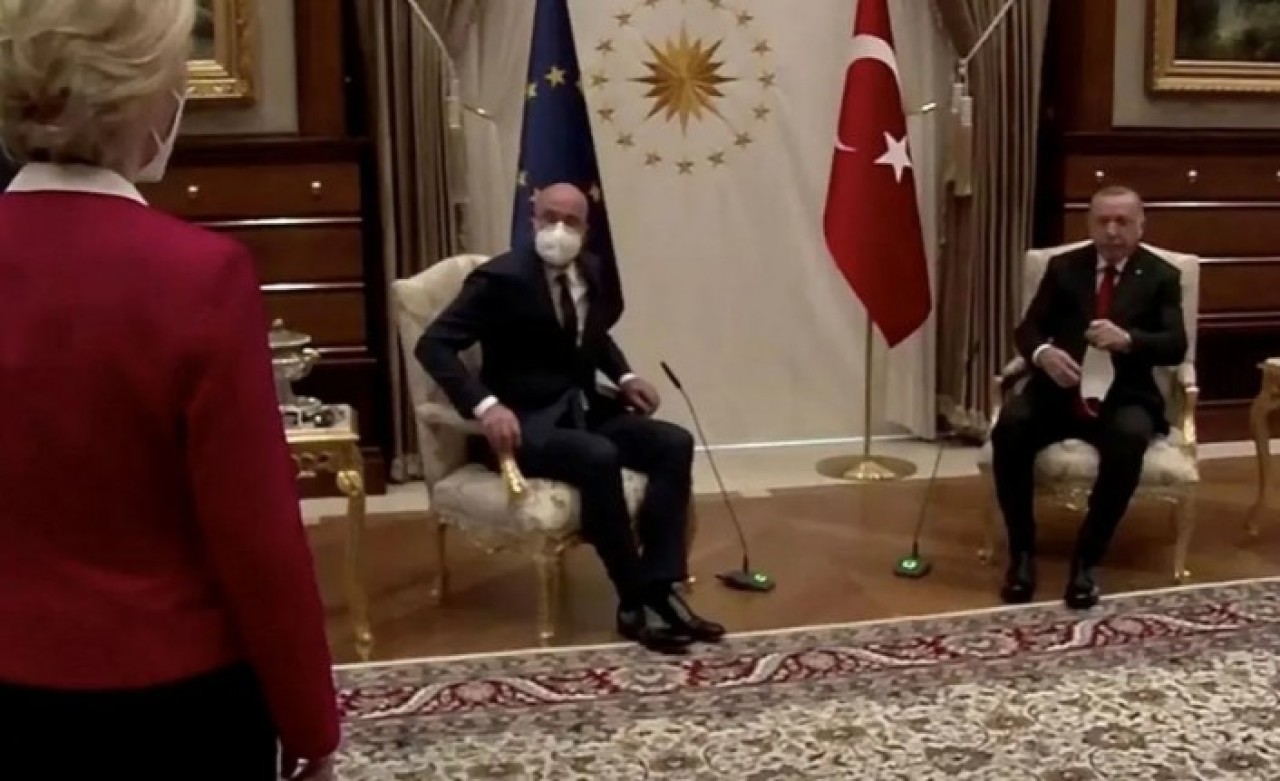 AB Konseyi Başkanı Michel'in Cumhurbaşkanlığı Külliyesi'ndeki görüşmede, Cumhurbaşkanı Erdoğan ile yan yana sandalyelerde oturması, AB Komisyonu Başkanı Ursula von der Leyen'in ise daha uzakta bir koltukta oturması ziyaretten bu yana tüm dünyada yankı uyandırmaya devam ediyor.