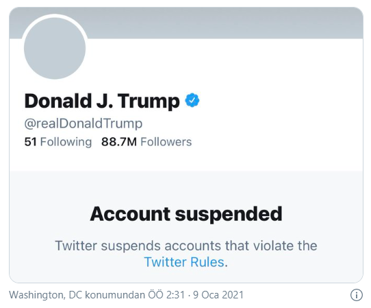 Twitter, çarşamba günkü Kongre baskınının ardından Trump'ın hesabını 12 saatliğine askıya almış ve şiddete teşvik eden paylaşımların sürmesi durumunda hesabın kapatılacağını duyurmuştu.