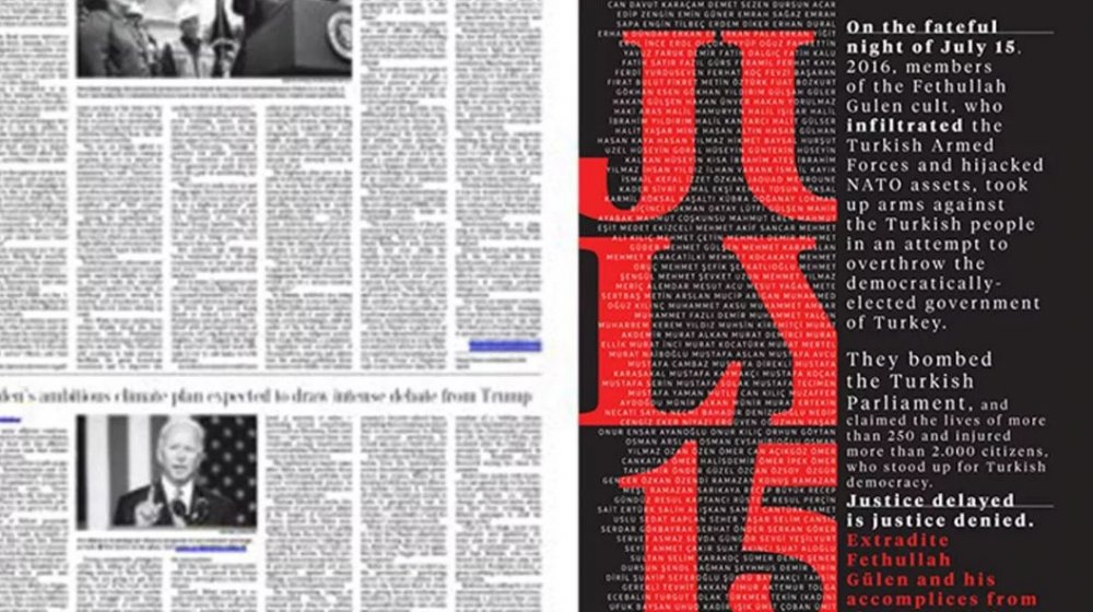 Darbe girişimcilerinin Türkiye Büyük Millet Meclisini (TBMM) uçaklarla bombaladığı hatırlatılan ilanda, darbe girişiminin, Türk demokrasisini savunmak için ayağa kalkan 250’den fazla vatandaşın ölümüne, 2 binden fazla kişinin de yaralanmasına neden olduğunun altı çizildi. "Ertelenmiş adalet reddedilmiş adalettir." ifadesi kullanılan ilanda, "Fetullah Gülen’i ve suç ortaklarını iade edin." çağrısında bulunuldu.