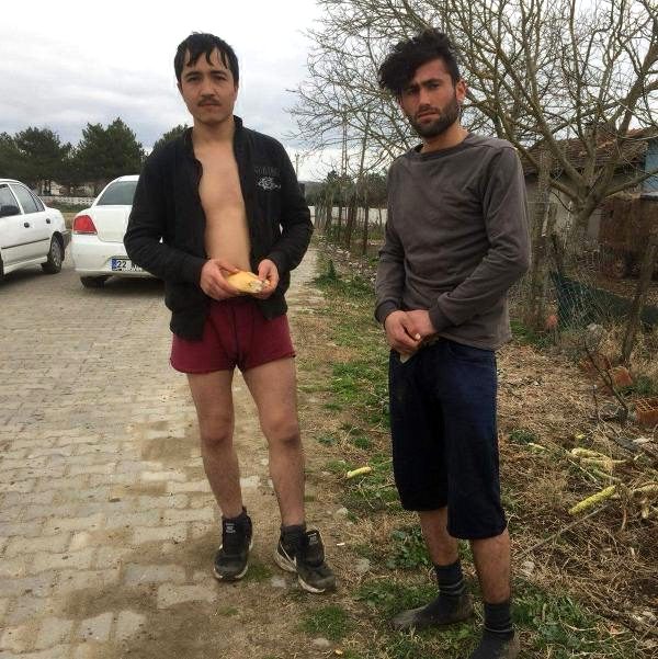 Göçmenlerden birinin omzunda darp izleri bulunurken, diğerinin ise pantolonsuz olduğu görüldü. İki gündür yemek yemediklerini söyleyen göçmenlere, diğer göçmenler yanlarında bulunan kıyafetleri verdi.