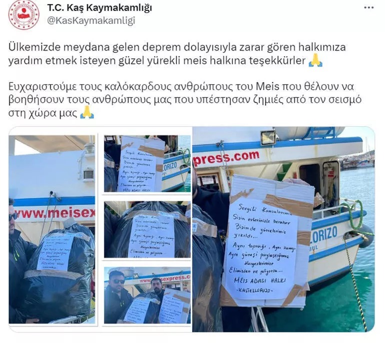 Kaş Kaymakamlığı ise sosyal medya üzerinden Meis halkına, "Ülkemizde meydana gelen Deprem dolayısıyla zarar gören halkımıza yardım etmek isteyen güzel yürekli Meis halkına teşekkürler" cevabını verdi.