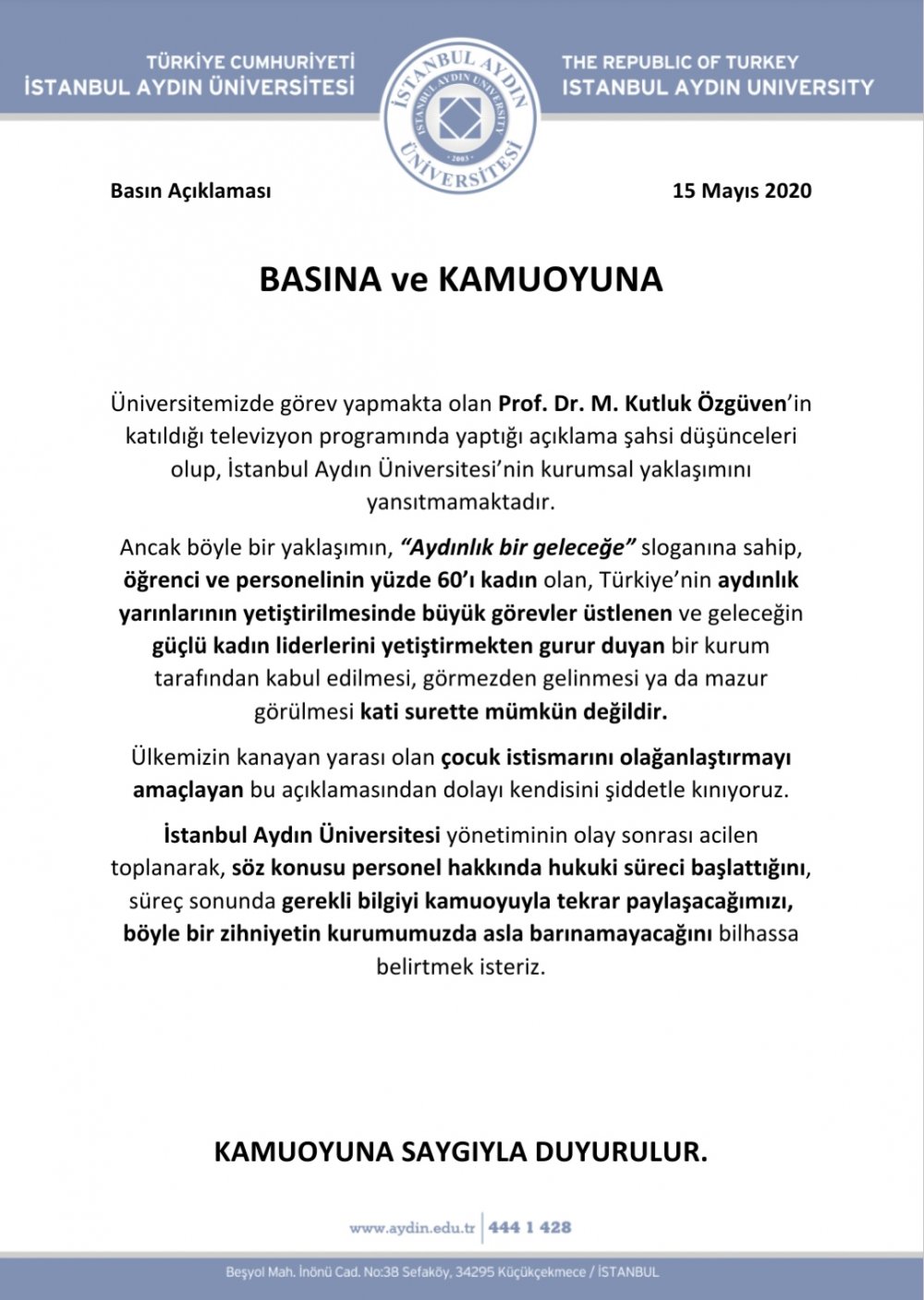 "Prof. Dr. Kutluk Özgüven’in, katıldığı televizyon programında, Üniversitemizin felsefesine tamamen zıt ve kabul edilmesi mümkün olmayan açıklamalarından dolayı İstanbul Aydın Üniversitesi ile ilişiği kesilmiştir. KAMUOYUNA DUYURULUR."