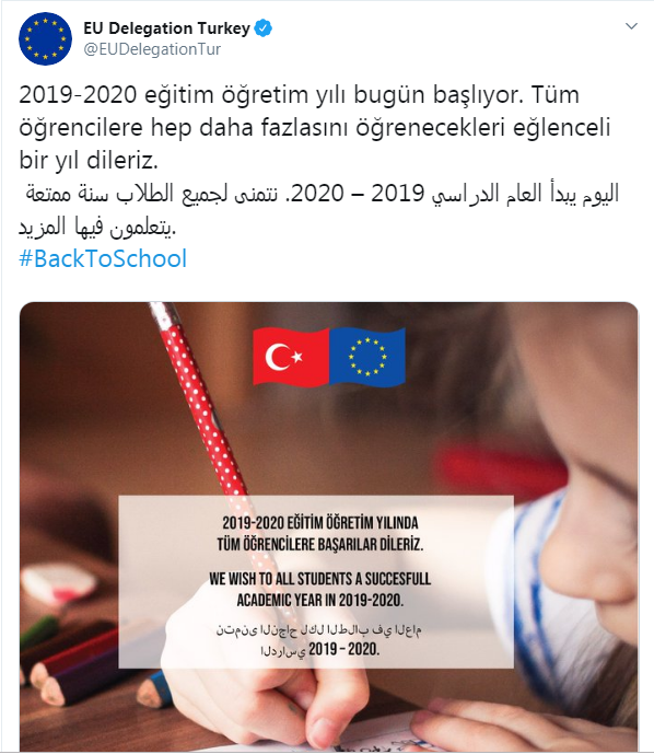 Avrupa Birliği'nin resmi Twitter hesabı 'EU Delegation Turkey'in yaptığı paylaşım sosyal medyada büyük yankı uyandırdı. EU Delegation Turkey adlı sayfada, Türkiye'nin 2019-2020 eğitim-öğretim yılı hem Türkçe hem de Arapça olarak yayınlandı.