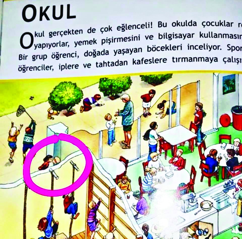 Eğitim hayatının çocuklara tanıtıldığı 'Okul' başlıklı sayfanın resminde, bir duvar köşesinde dudak dudağa öpüşen küçük çocukların görseli bulunuyor. Görselin, birçok çocuk görüntüsünün arkasına yerleştirildiği dikkat çekiyor. Kitaba Kültür Bankanlığı tarafından sansür uygulanması bekleniyor.