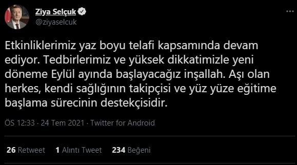 Selçuk, bundan önce yaptığı açıklamada “Türkiye’nin şu anda, şu aşamada okulları açmaktan daha önemli bir işi olmaması lazım. Artık bu ülke çocuklarını daha fazla eve kapatmamalı, öğretmenlerini daha fazla yormamalı. Velilerimizi daha çok yormamalıyız. Okullarımızı açmalıyız, inşallah 6 Eylül’de açacağız. Hep birlikte bunun için ne gerekiyorsa yapacağız” demişti.