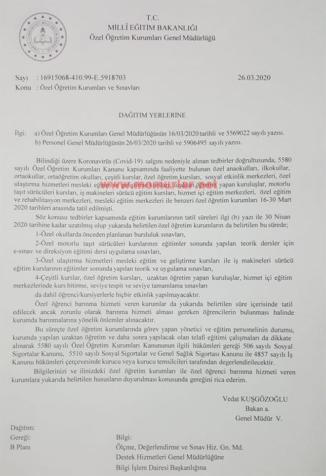 Milli Eğitim Bakanlığı özel motorlu taşıt sürücüleri kurslarının verdiği eğitimler sonrasında yapılan teorik ders sınavları ile direksiyon eğitimi dersi uygulama sınavlarının 30 Nisan'a kadar iptal edildiğini duyurdu.