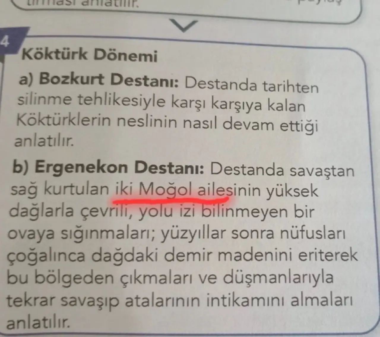 Basılı ders kitabında Ergenekon Destanı için, “Destanda savaştan sağ kurtulan iki Moğol ailesinin, yüksek dağlarla çevrili ve yolu izi bilinmeyen bir ovaya sığınmaları; yüzyıllar sonra nüfusları çoğalınca dağdaki demir madenini eriterek bu bölgeden çıkmaları ve düşmanlarıyla tekrar savaşıp, atalarının intikamını almaları anlatılır” denildi.