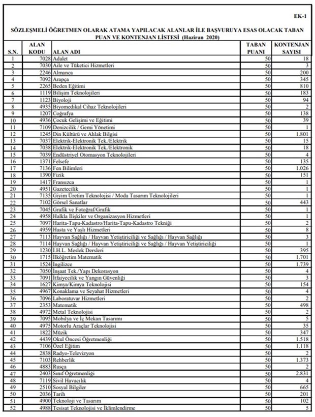 MEB, 2020 Haziran ayında yapılacak olan sözleşmeli öğretmen atama kontenjan listesi (Ek-1) ile atama takvimi (Ek-4) listesini yayımladı.