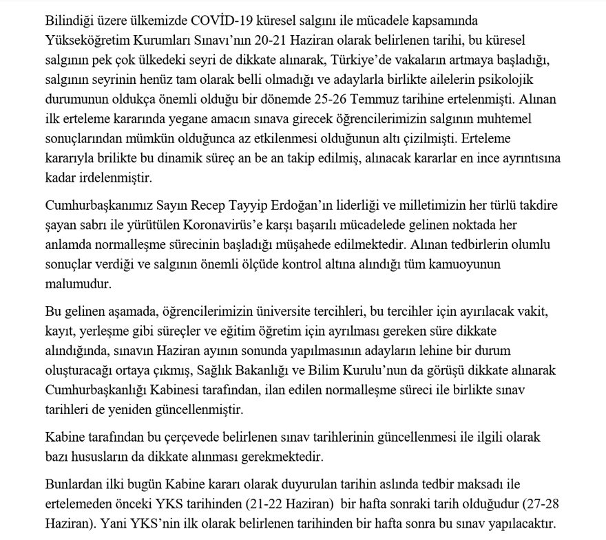 Saraç, “2020-YKS’ye yönelik sadece bu seneye özel olmak üzere öğrencilerimizi sevindirecek güzel haberlerimiz var” ifadelerini kullandıktan sonra şu açıklamayı yaptı: