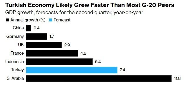 Öte yandan Bloomberg tam ve kapsamlı bir değerlendirme için bugünkü Türkiye İstatistik Kurumu'nun açıklamalarına işaret etmişti. TÜİK, 2022 ikinci çeyreğine ilişkin büyüme rakamlarını açıkladı. Açıklamaya göre, Türkiye ekonomisi yılın ikinci çeyreğinde yüzde 7.6 büyüdü.