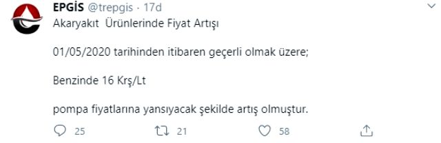 Enerji Petrol Gaz İkmal İstasyonları İşveren Sendikası'ndan (EPGİS) yapılan açıklamaya göre benzine 16 kuruş zam geldi. Bu gece yarısından itibaren geçerli olacak zam, pompa fiyatlarına yansıyacak.