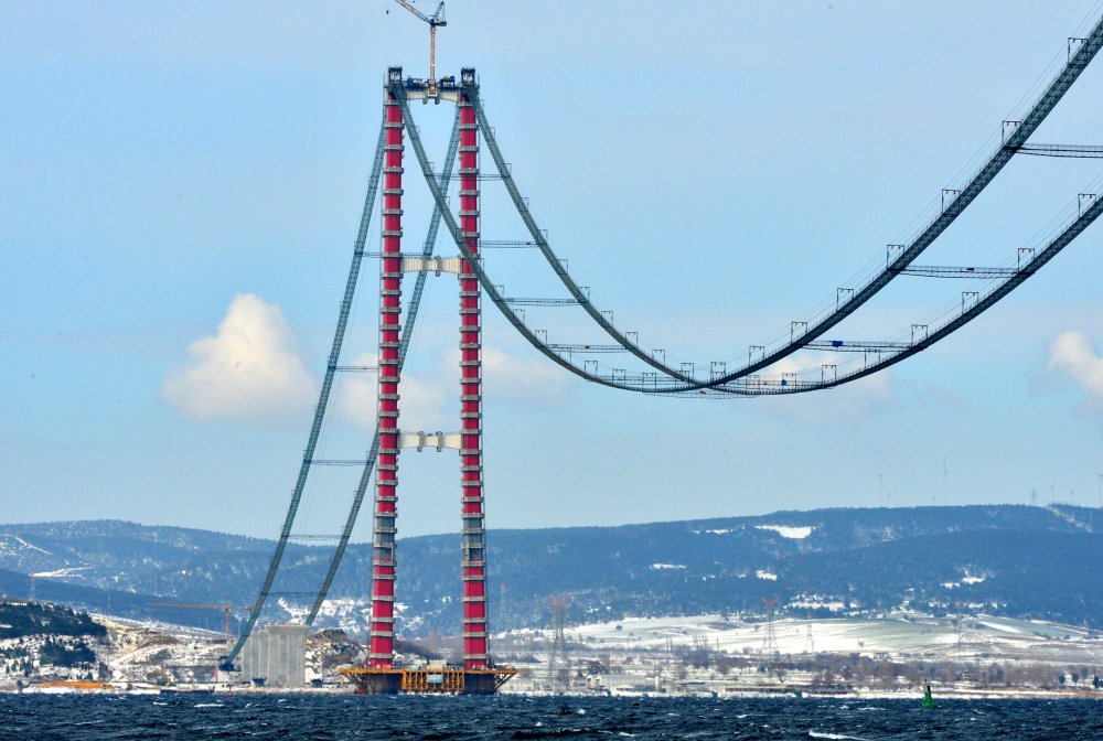 Çanakkale Boğazı'nın Avrupa ve Asya yakalarını birleştirecek 1915 Çanakkale Köprüsü'nün yapımı, "kedi yolunun" tamamlanmasının ardından deniz üstü çalışmalarla devam ediyor.