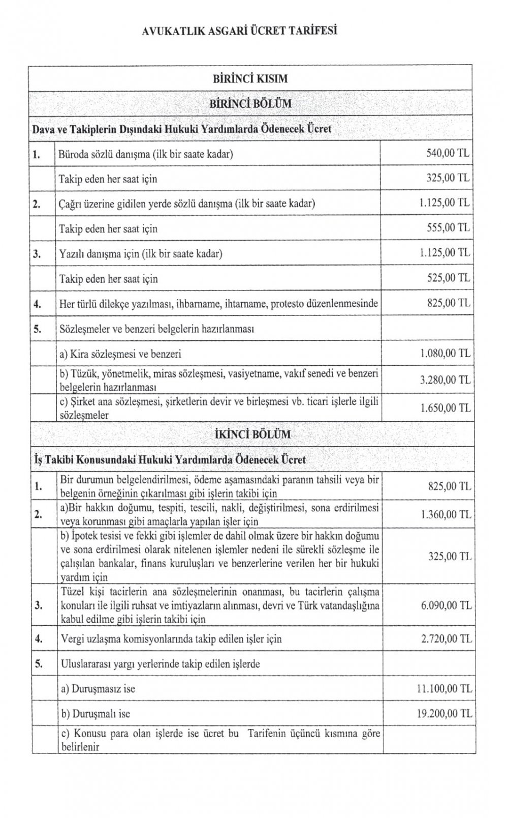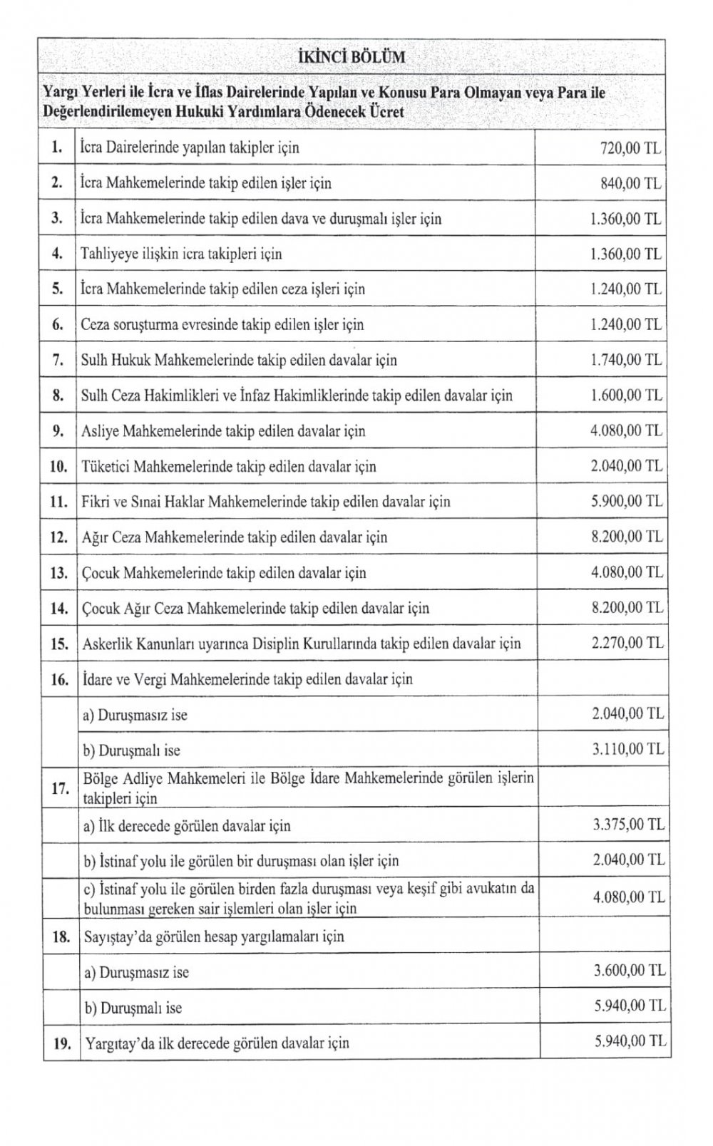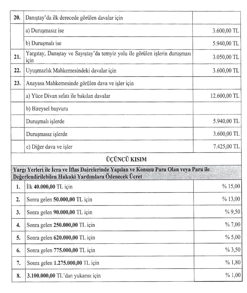 Avukatlara hukuki yardımlar, davalar, yürütülecek iş ve işlemler karşılığında ödenecek yeni ücretler belirlendi. Ortalama yüzde 20 zamlanan yeni avukatlık asgari ücret tarifesi bugün Resmi Gazete’de yayımlanarak yürürlüğe girdi.