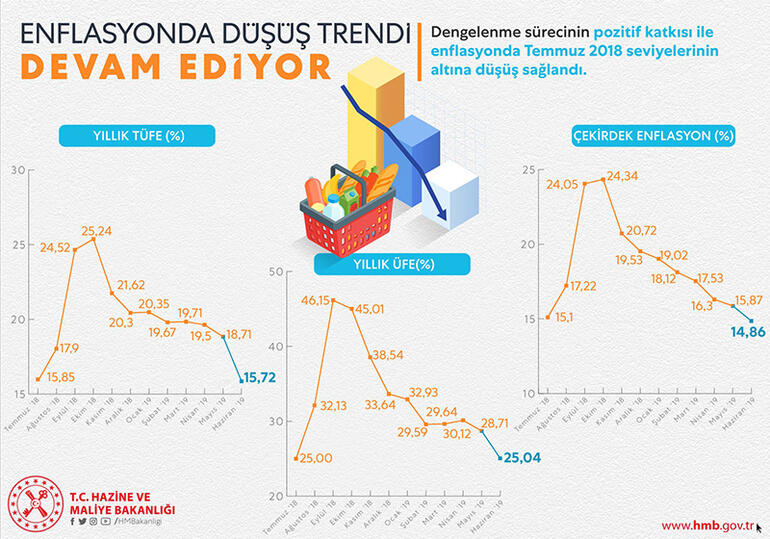 Sosyal medya hesabından bir açıklama yapan Bakan Albayrak, "Enflasyonda düşüş trendi sürüyor. Haziran rakamları ile yıllık hedefimizin altına geldik. Gıda tarafındaki kazanımlarımızı özellikle yapısal adımlarımızla koruyacak ve önce tek haneli enflasyonları görecek, ardından yılı hedeflerimizin altında bir oranda kapatacağız." dedi.
