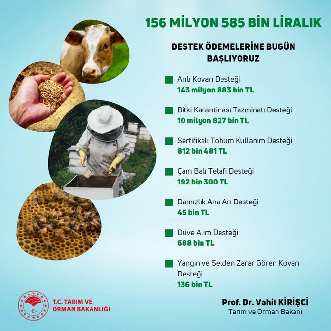 Buna göre, arılı kovan desteği 143 milyon 883 bin lira, bitki karantinası tazminatı desteği 10 milyon 827 bin lira, sertifikalı tohum kullanım desteği 812 bin 481 lira, çam balı telafi desteği 192 bin 300 lira, damızlık ana arı desteği 45 bin lira, düve alım desteği 688 bin lira, yangın ve selden zarar gören kovan desteği 136 bin lira olarak ödenecek.
