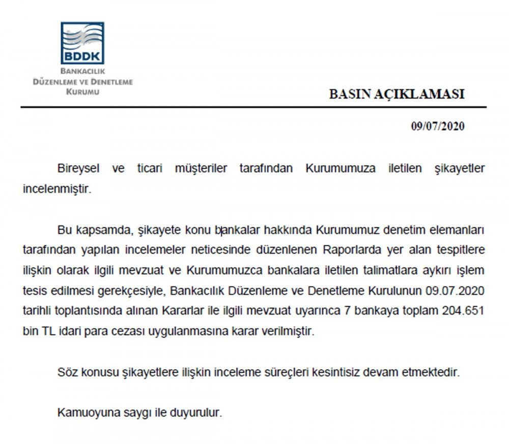 - Bu kapsamda, şikayete konu bankalar hakkında Kurumumuz denetim elemanları tarafından yapılan incelemeler neticesinde düzenlenen Raporlarda yer alan tespitlere ilişkin olarak ilgili mevzuat ve Kurumumuzca bankalara iletilen talimatlara aykırı işlem tesis edilmesi gerekçesiyle, Bankacılık Düzenleme ve Denetleme Kurulunun 09.07.2020 tarihli toplantısında alınan Kararlar ile ilgili mevzuat uyarınca 7 bankaya toplam 204.651 bin TL idari para cezası uygulanmasına karar verilmiştir.