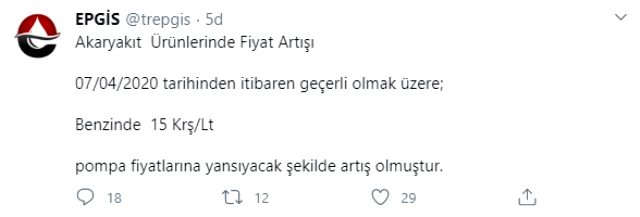 "7 Nisan tarihinden itibaren geçerli olmak üzere; benzinde15 Krş/Lt pompa fiyatlarına yansıyacak şekilde artış olmuştur."