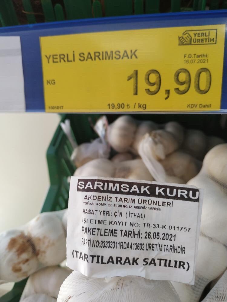 Denetle adlı hesaptan “Çin’den ithal edilen sarımsaklar Yerli Sarımsak etiketleriyle ve Yerli Üretim logosuyla satılmaya devam ediyor” mesajı paylaşıldı.