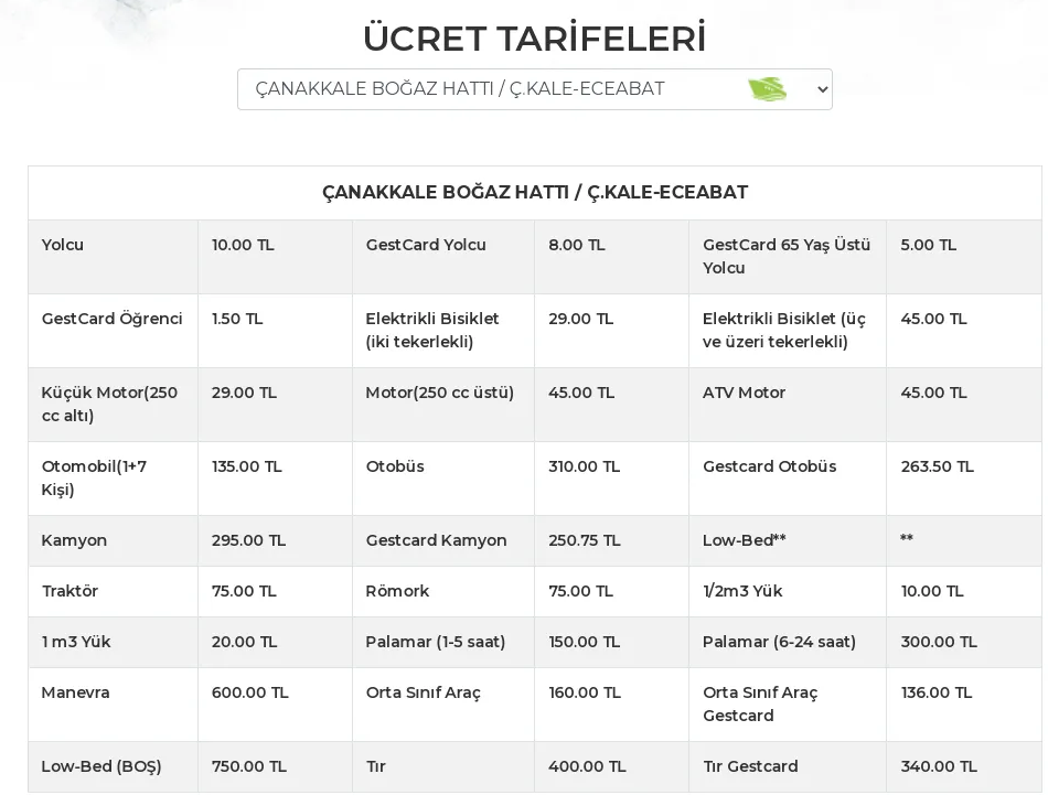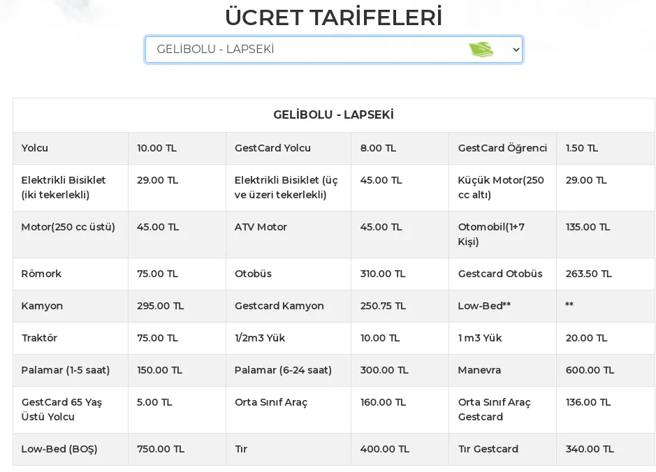 Gelibolu -Lapseki feribot ücretleri 20 Nisan 2022 zamlı tarife şöyle: