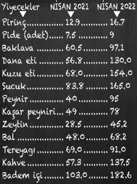 TÜİK Nisan 2021 fiyatları ile 2022 Mart fiyatları karşılaştırınca durum şöyle: