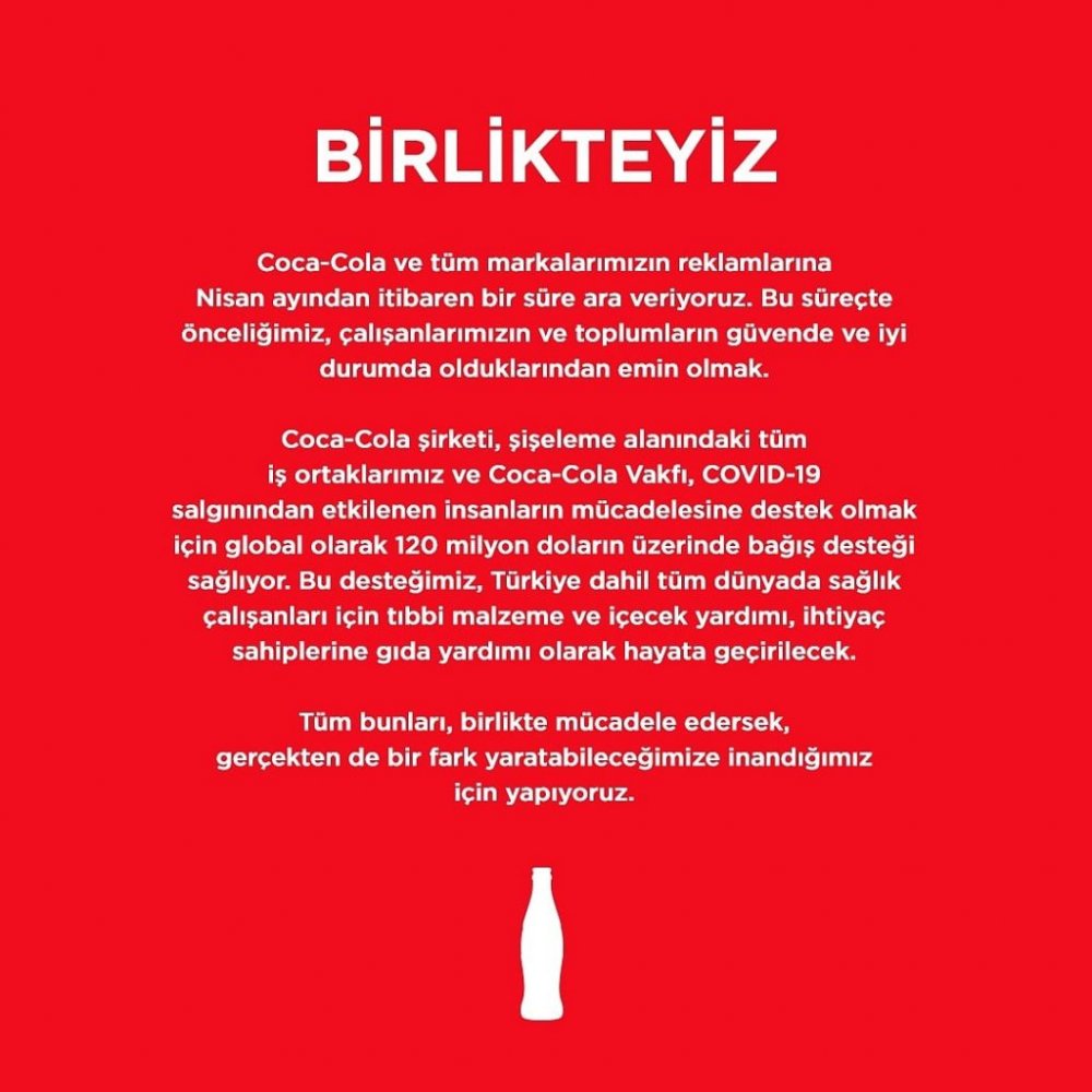“Coca-Cola ve tüm markalarımızın reklamlarına Nisan ayından itibaren bir süre ara veriyoruz. Bu süreçte önceliğimiz, çalışanlarımızın ve toplumların güvende ve iyi durumda olduklarından emin olmak. Birlikte mücadele edersek, gerçekten de bir fark yaratabileceğimize inanıyoruz.” sözlerine yer verilirken paylaşılan görselde ihtiyaç sahipleri için gıda yardımı yapılacağı da belirtildi.