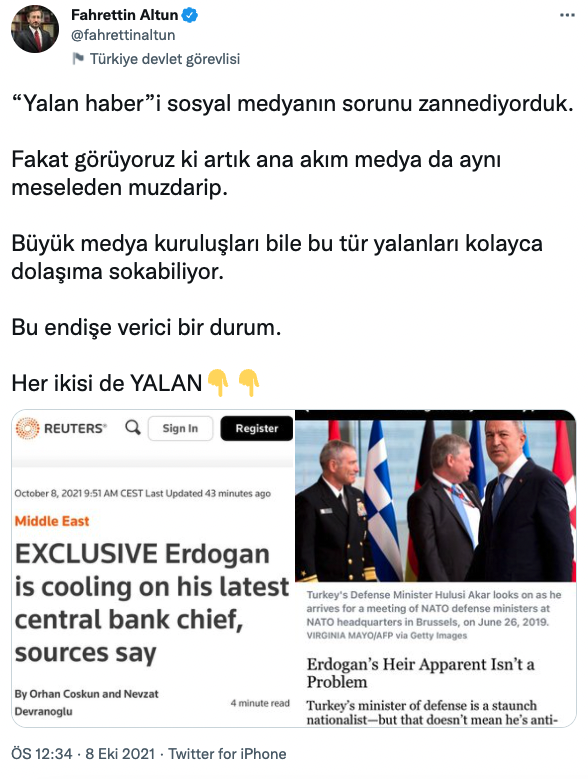 Fahrettin Altun, paylaşımında, "Yalan haberi sosyal medyanın sorunu zannediyorduk. Fakat görüyoruz ki artık ana akım medya da aynı meseleden muzdarip. Büyük medya kuruluşları bile bu tür yalanları kolayca dolaşıma sokabiliyor. Bu endişe verici bir durum. Her ikisi de yalan." ifadelerini kullandı.