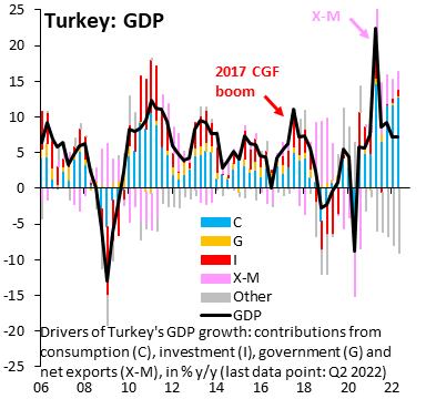 Dünyaca ünlü ünlü Uluslararası Finans Enstitüsü Başekonomisti Robin Brooks, gelişmekte olan ülke ekonomilerini değerlendirdi. Sosyal medya hesabından yaptığı grafikli paylaşımda Türkiye ekonomisine ilişkin verileri paylaştı. Türkiye'nin net ihracatının son 2 yılda GSYİH'ye olumlu katkıda bulunduğunun altını çizen Brooks, "Türkiye ekonomisi muazzam bir patlamayı yapabilir. dedi.