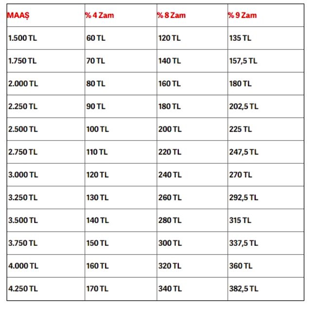 İşte % 4, % 8 ve % 9'luk oranlara göre maaşlara yapılacak zam senaryoları: