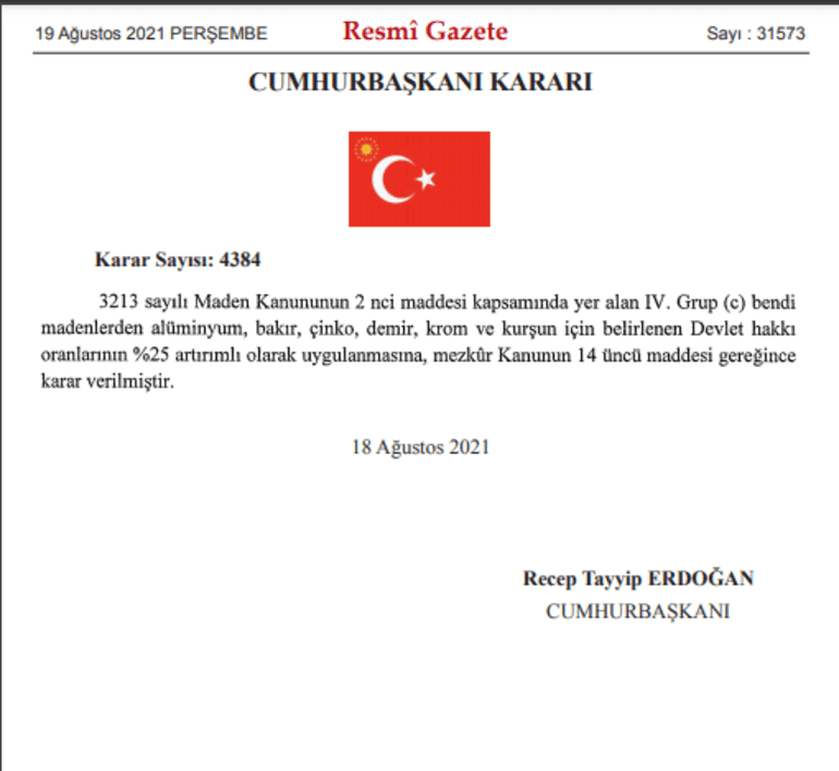 Buna göre, dördüncü grup madenler arasında yer alan alüminyum, bakır, çinko, demir, krom, kurşundan alınan ve "maden istihracı ile sağlanacak gelirden devlet payına düşen ve ödeme yükümlülüğü ruhsat sahibine ait olan kısım" olarak tanımlanan devlet hakkının yüzde 25artırımlı olarak uygulanmasına karar verildi.
