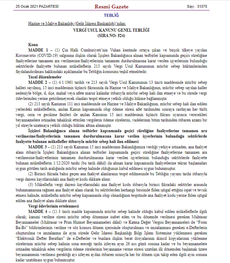 Kovid-19 salgını nedeniyle faaliyetlerine ara verilen iş yerlerinin gelir vergisi, stopaj ve KDV beyannamelerinin verilme ve ödeme süreleri ertelendi.
