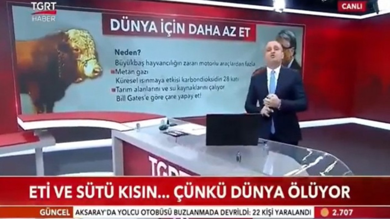 "Büyükbaş hayvan dünya için tehlikeli olabilir mi? Cevap doğru, hadi gelin anlatayım. Ne kadar az et, ne kadar süt ve süt ürünleri tüketirsek dünya için o kadar faydalı iş yapmış olacağız. Bırakın şimdi protein meselesini falan. Büyükbaş hayvancılığın zararı inanın gazlar düşünüldüğünde, ortaya çıkan metan gazı, arabalardan çok daha fazla..."