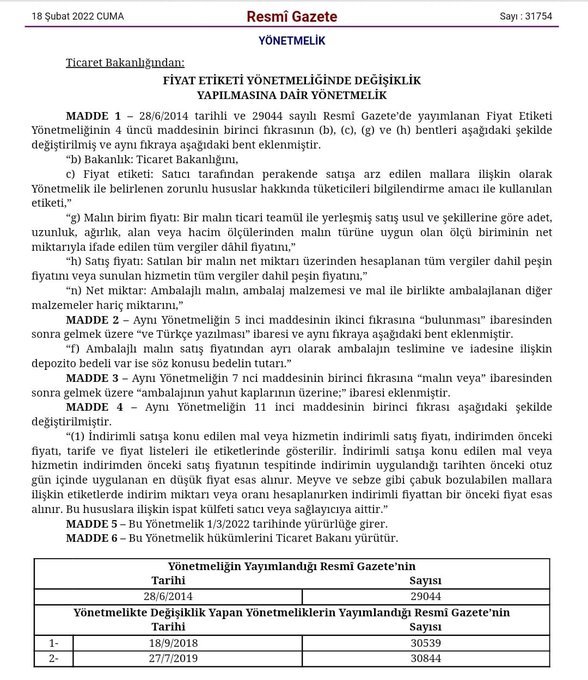 Ticaret Bakanlığı tarafından hazırlanan "Fiyat Etiketi Yönetmeliği'nde Değişiklik Yapılmasına Dair Yönetmelik, Resmi Gazete'de yayımlandı.