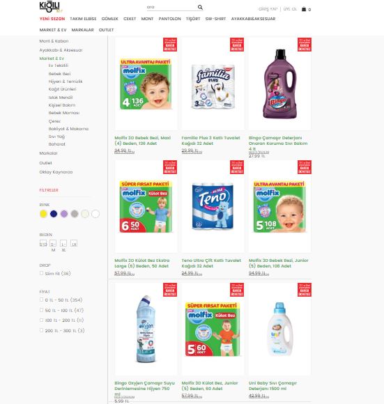 Kigili.com sitesinde satılan ürünler ise daha çok, bebek bezi, sıvı yağ, bakliyat, tuvalet kağıdı, çerez, makarna, çamaşır suyu gibi pek çok ürünlerden oluşuyor.