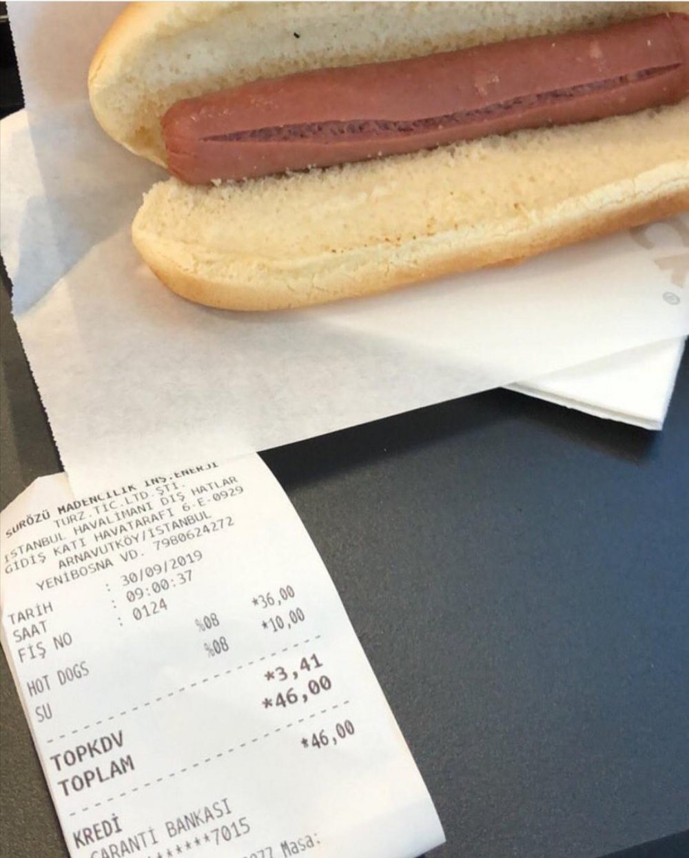 Ekşi Sözlük adlı platformda paylaşılan bir gönderide, bir adet ekmek arası sosis ve bir suyun fiyatı görenleri şaşkına çeviriyor. Sosislinin 36 TL, suyun ise 10 TL'ye satıldığı Havaalanı'nda, yolcular fiyatlara büyük tepki gösteriyor.