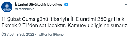 * 11 Şubat Cuma günü itibariyle İHE üretimi 250 gr Halk Ekmek 2 TL'den satılacaktır. Kamuoyu bilgisine sunarız.