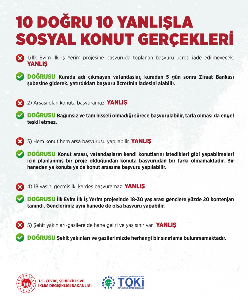 Çevre, Şehircilik ve İklim Değişikliği Bakanlığı, “İlk Evim İlk İş Yerim” projesiyle ilgili kamuoyunda yanlış olarak ifade edilen ve bilgi kirliliğine yol açan doğru bilinen yanlışları tek tek açıkladı.