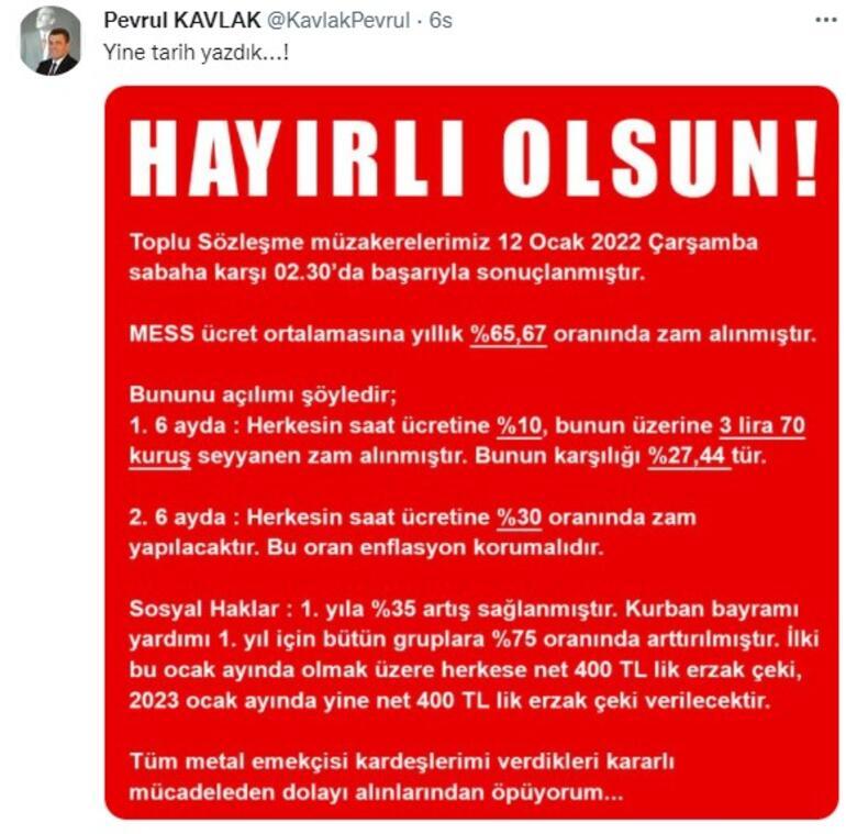 Türk Metal Sendikası Genel Başkanı Pevrul Kavlak, anlaşmayı Twitter hesabından duyurdu ve "Tarih yazdık!" ifadelerini kullandı. Kavlak'ın paylaşımı şu şekilde: