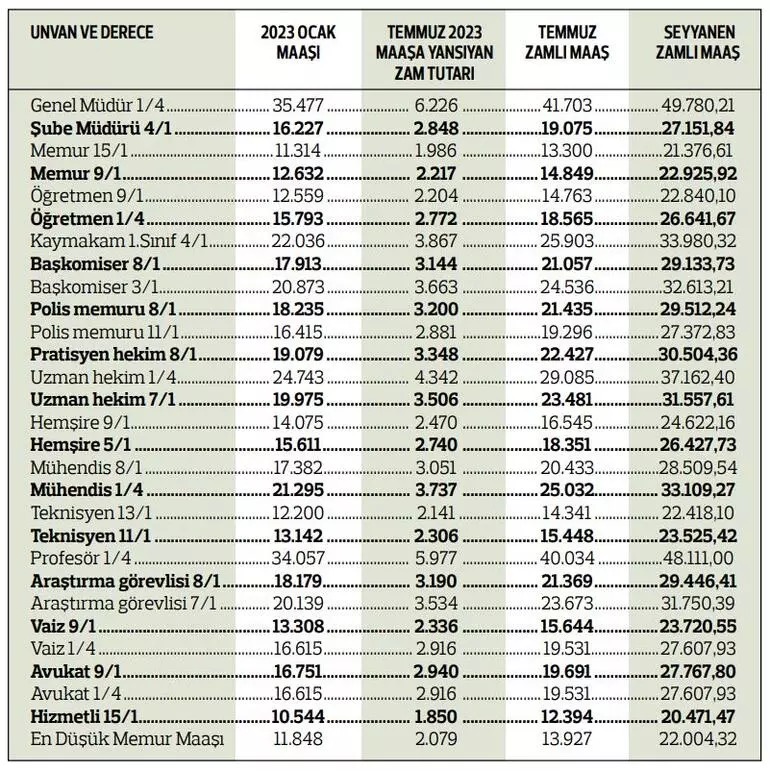 Bu çerçevede görevdeki memurlar temmuz maaşlarını; toplu sözleşme zammı, üzerine enflasyon farkı, bunun da üzerine 8 bin 77 lira seyyanen zamlı alacak. Böylece 2023’ün ocak ayında 11 bin 848 lira olan en düşük memur maaşı temmuz ayında 22 bin liraya çıkacak. Seyyanen zamla birlikte ortalama memur maaşı da 25 bin liraya yükselmiş olacak.