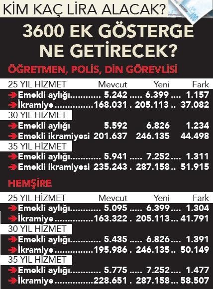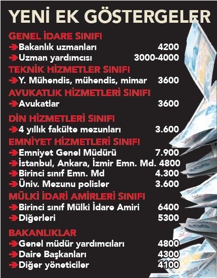 Ek gösterge çalışması ile polis, din görevlisi, öğretmen ve hemşire dışında kalan diğer unvanların ek gösterge rakamları 500-750 arası artırılacak.