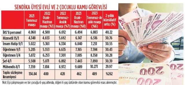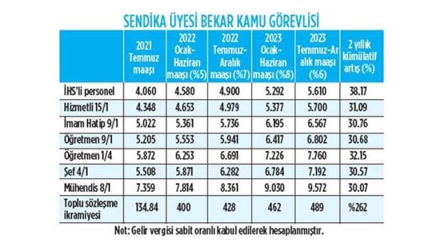 Yapılan zamla birlikte sendika üyesi bekar idari hizmetler sınıfında 4.060 TL alan bir memurun maaşı gelecek yılın ilk yarısında 4.580 TL, ikinci yarısında da 4.900 TL'ye çıkacak. Bir sonraki yıl ise ilk yarıda 5.292 TL, ikinci altı ayda da 5.610 TL olacak. Böylece iki yıllık kümülatif artış yüzde 38.17 olacak. Bir mühendisin 7.359 TL olan maaşı gelecek yıl ilk yarıda 7.814, ikinci yarıda da 8.361 TL'ye çıkacak. 2023 yılında da ilk yarıda 9.030, ikinci altı ayda da 9.572 TL'ye yükselecek.