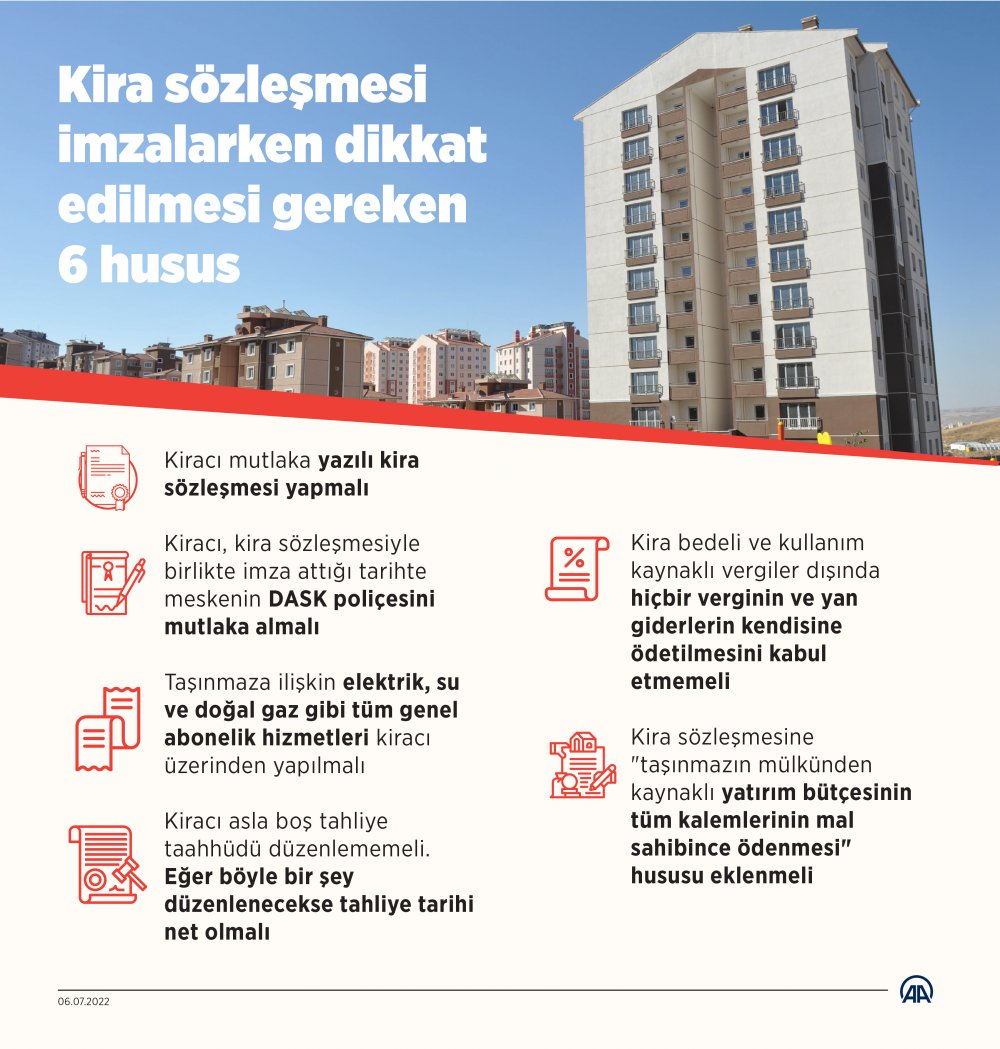 "Birincisi; kiracı mutlaka ve mutlaka yazılı kira sözleşmesi yapmalı. Sözlü kira sözleşmesine itibar edilmemeli. İkincisi; kiracı, kira sözleşmesiyle birlikte imza attığı tarihte meskenin DASK poliçesini mutlaka almalı. Üçüncüsü; taşınmaza ilişkin elektrik, su ve doğal gaz gibi tüm genel abonelik hizmetleri kiracı üzerinden yapılmalı. Dördüncüsü; kiracı asla boş tahliye taahhüdü düzenlememeli. Eğer böyle bir şey düzenlenecekse tahliye tarihi net olmalı.