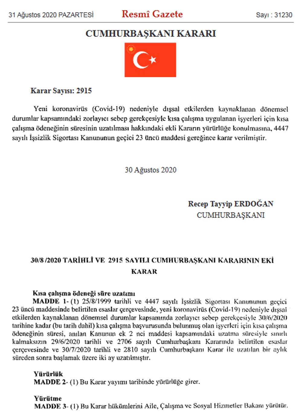 Cumhurbaşkanı kararıyla kısa çalışma ödeneğinin süresi iki ay daha uzatıldı.