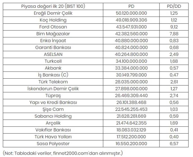 BIST 100 endeksine dahil ve piyasa değeri açısından en büyük 20 şirketin piyasa değeri ile piyasa değeri/defter değeri oranları şöyle: