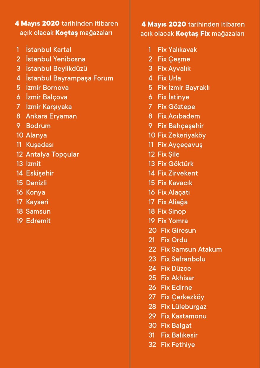 Koronavirüs nedeniyle 24 Mart'ta kapanan Koçtaş ve Koçtaş Fix mağazalarının 4 Mayıs Pazartesi günü yeniden açılacağı duyuruldu.