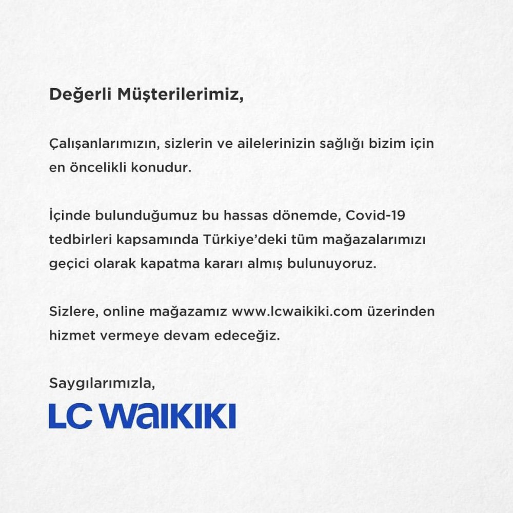 Dünyaca ünlü Zara, Apple, Ferrari gibi büyük firmalar koronavirüs tedbirleri kapsamında dünyaynın çeşitli yerlerindeki şube ve fabrikaları kapatma kararı almıştı. Ardından LC Waikiki'de aynı karara vardı. Marka tüm Türkiye'deki mağazalarını kapatma kararı aldığını bildirdi.