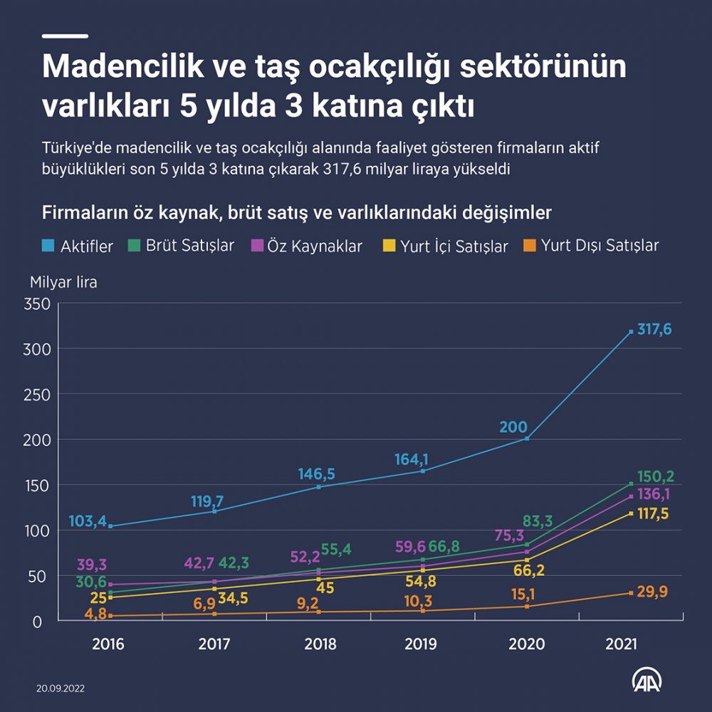 AA muhabirinin, Türkiye İstatistik Kurumu ve Türkiye Cumhuriyet Merkez Bankası iş birliğiyle yapılan "Sektör Bilançoları 2021" araştırması sonuçlarından derlediği bilgiye göre, madencilik ve taş ocakçılığı alanında faaliyet gösteren firmaların aktif büyüklükleri son 5 yılda düzenli artış gösterdi.